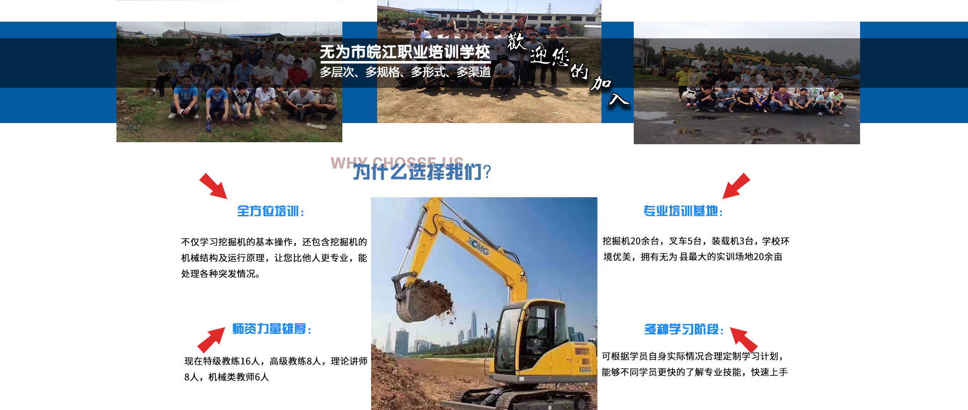 关于我们无为市皖江职业培训学校是2010年4月经国家劳动部门、人力资源社会保障局、民政局共同批准成立的一所技能型培训学校。是全市城镇登记失业人员,进城求职农村劳动者,未就业的高校毕业生和城乡未继续升学的初、高中往应届毕业生,退役士兵、退补渔民等各类人员就业技能培训基地。是无为市工程机械培训考核机构,也是无为市一所特种作业考核培训单位(挖掘机驾驶培训、叉车驾驶培训、装载机驾驶培训等)。我校师资力量,现有教练24人,理论讲师8人,机械类教师6人,学校拥有各类特种作业教学品牌机械:挖掘机20余台,叉车5台,装载机3台,学校环境优美,在无为市有实训场地20余亩,整洁宽敞的学员宿舍给学员家的感觉,校食堂可一次性容纳近百人同时就餐。有多媒体教室,每天都可以让学员自由练习。完善的教学模示,让每位学员从兴趣出发,真正的容入到教学中去,师资力量认真严谨的教学理念奠定了皖江职业学校将来的发展轨迹。我校以诚信办学,以服务社会为宗...